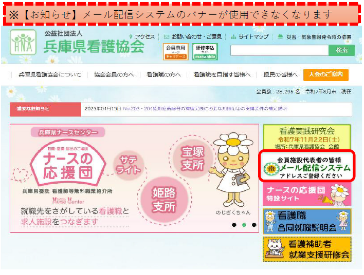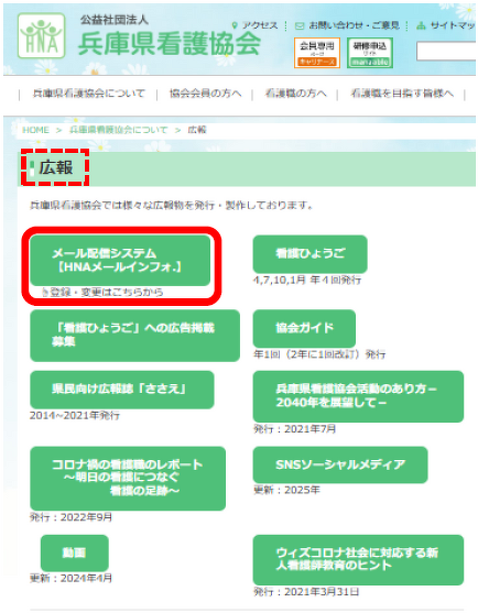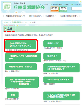 2025年10月06日(月) その他 < お知らせ 「メール配信システム【HNAメールインフォ.】」のアドレス登録・変更ページを移動しました。 ◆バナー移動に伴うURL変更のお知らせ◆ URLを登録している方は、変更をお願いします。 変更後のURLはこちら 【変更前】 【変更後】 HOME > 兵庫県看護協会について > 広報 ※ご不明な点がございましたら、お問い合わせください(TEL 078-341-0190)