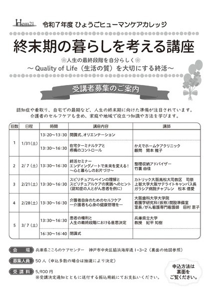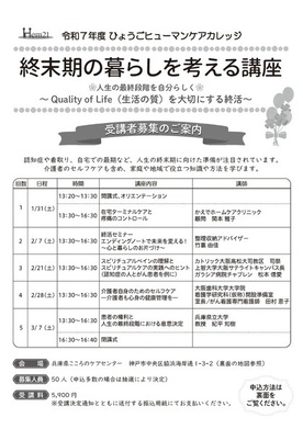 【他団体】〈兵庫県こころのケアセンター〉令和7年度ひょうごヒューマンケアカレッジ 「終末期の暮らしを考える講座」受講者募集のご案内