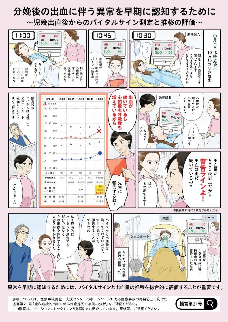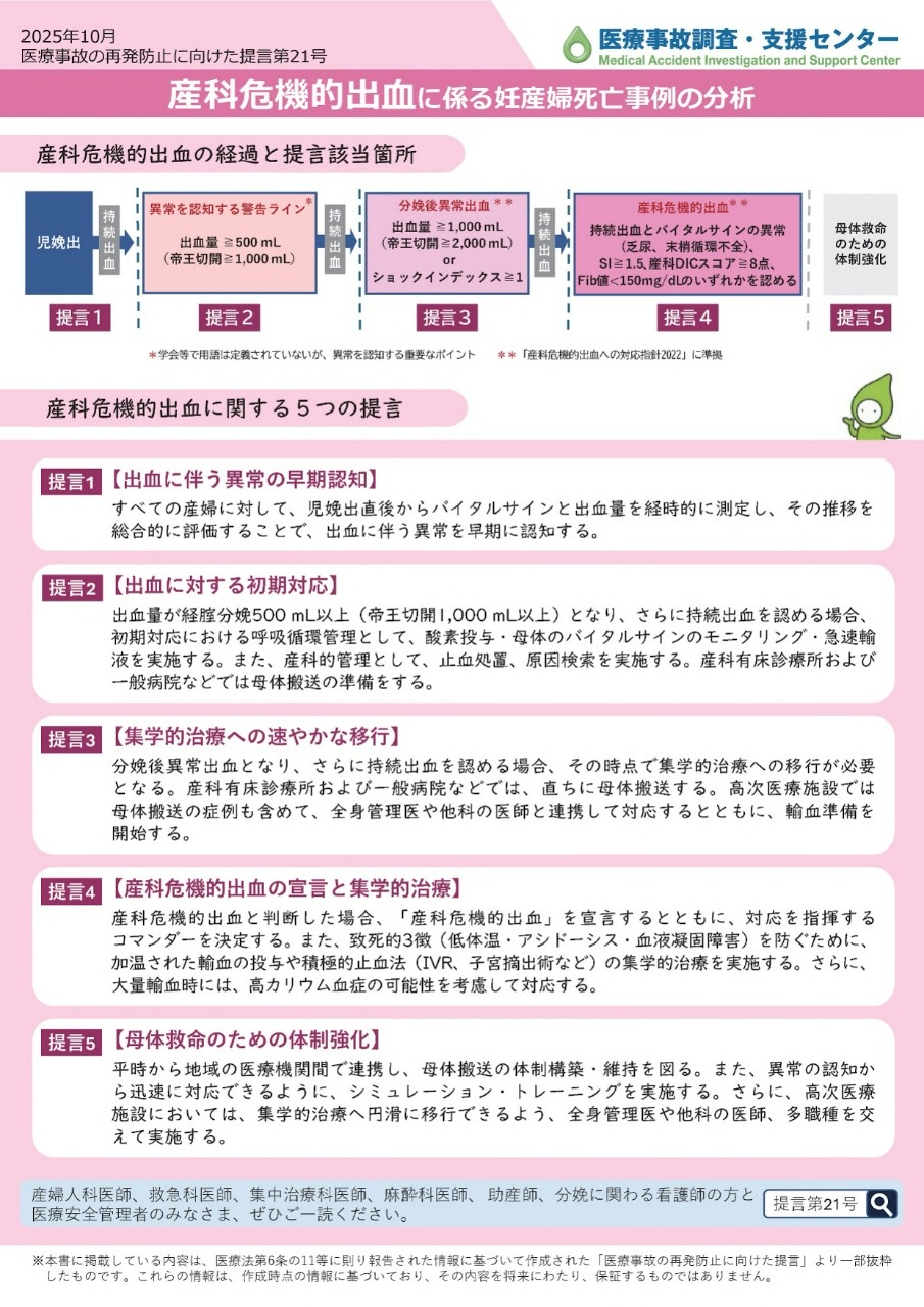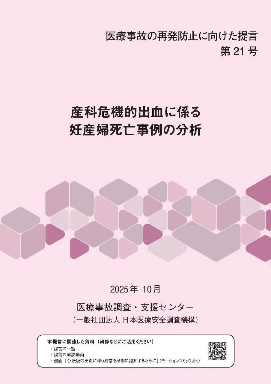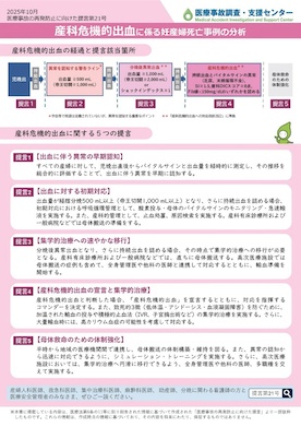 医療事故調査・支援センター(一般社団法人日本医療安全調査機構 )より、医療事故の再発防止に向けた提言第21号「産科危機的出血に係る妊産婦死亡事例の分析」が公表されました。