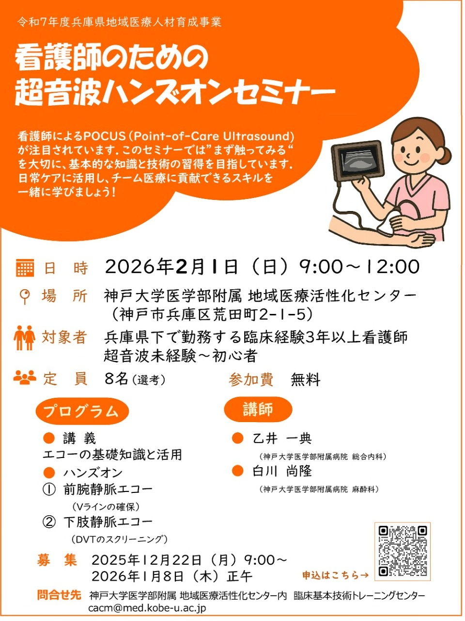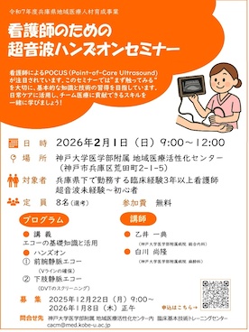 【他団体】〈神戸大学医学部 臨床基本技術トレーニングセンター 〉令和7年度「看護師のための超音波ハンズオンセミナー」開催のご案内