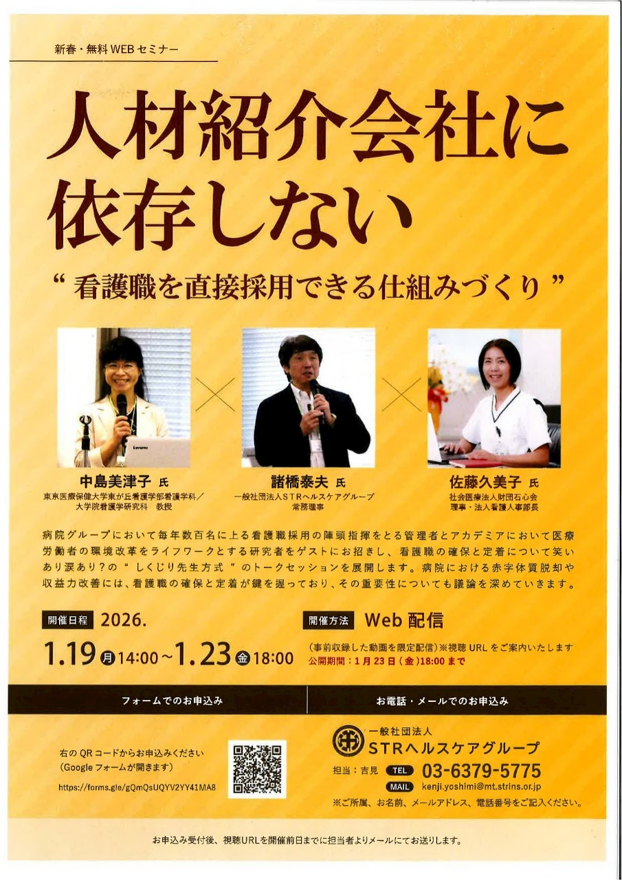 【他団体】〈STRヘルスケアグループ〉「人材紹介会社に依存しない "看護職を直接採用できる仕組みづくり" オンラインセミナー」開催のご案内