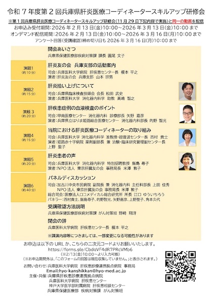 【他団体】〈兵庫県肝疾患診療連携拠点病院〉「令和7年度第2回兵庫県肝炎医療コーディネータースキルアップ研修会」開催のご案内