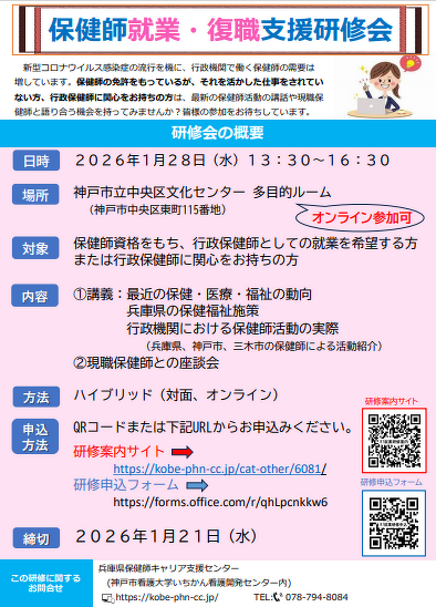 2025年10月30日(木) 研修 < お知らせ (他団体開催)兵庫県保健師キャリア支援センター 保健師就業・復職支援研修会 兵庫県保健師キャリア支援センター 保健師就業・復職支援研修会 詳細・お申し込みは、チラシ画像をクリックしてください。(外部サイトへ移動します) 開催日時 2026年1月28日(水) 13:30~16:30 開催場所 神戸市立中央区文化センター 多目的ルーム (神戸市中央区東町115番地) オンライン参加も可能です。 申込方法 兵庫県保健師キャリア支援センターホームページより 申込締切:1月21日(水)