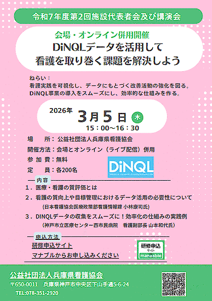 講演会におきましては、「DiNQLデータを活用して看護を取り巻く課題を解決しよう」をテーマに、日本看護協会医療政策部看護情報課の小林康司氏と神戸市立医療センター西市民病院 看護副部長の山本和代氏による講演を予定しております。